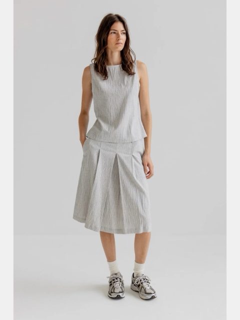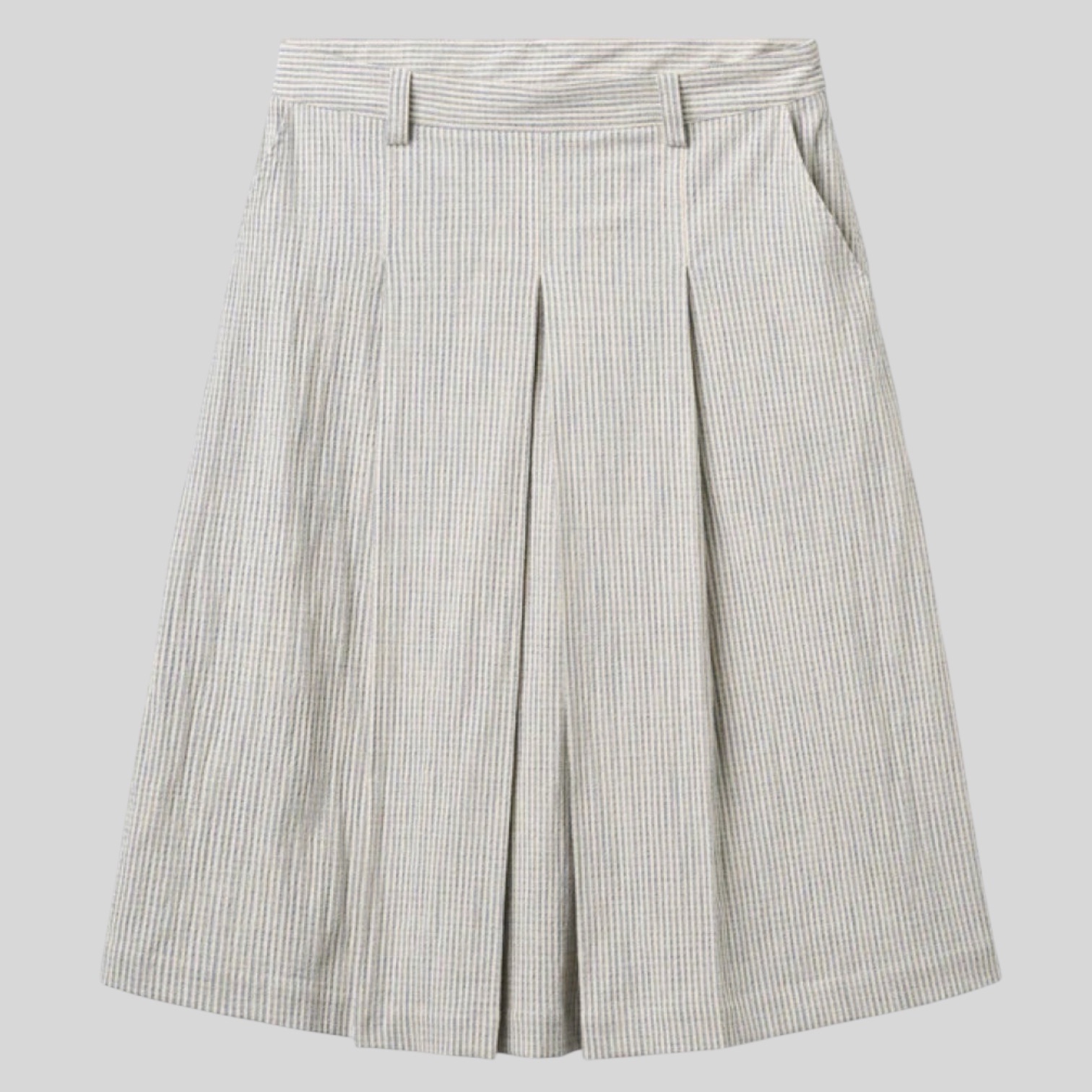 En seersucker-nederdel med en midi-længde og blød volumen. Designet med en ren talje, en lynlåslukning i siden og skrå sidelommer. Nederdelen har lægdetaljer foran og bagpå for en afslappet silhuet. Den teksturerede seersucker-overflade tilføjer en diskret struktur, samtidig med at den bevarer en let fornemmelse. Nederdelen kan kombineres med Sia-toppen eller Sally-jakken for et komplet sæt.