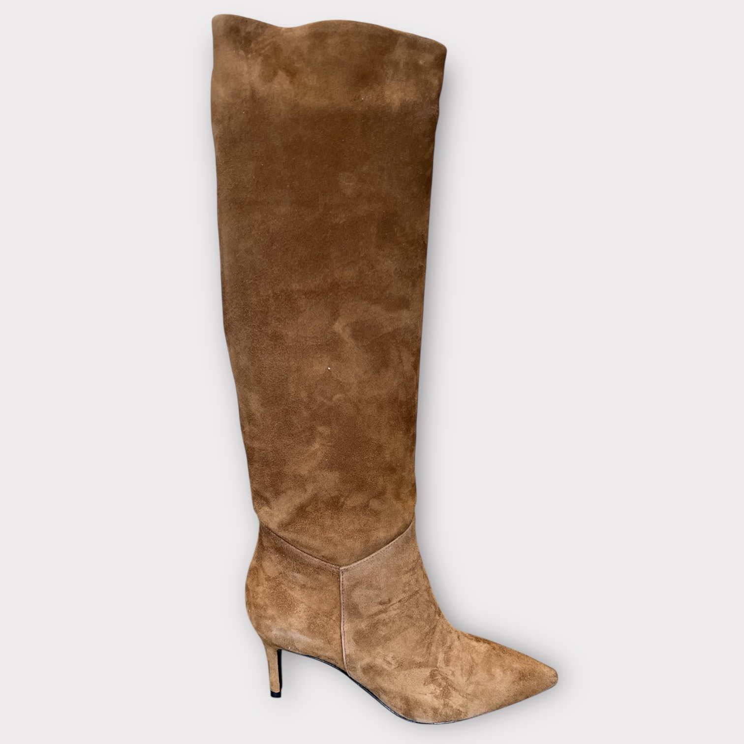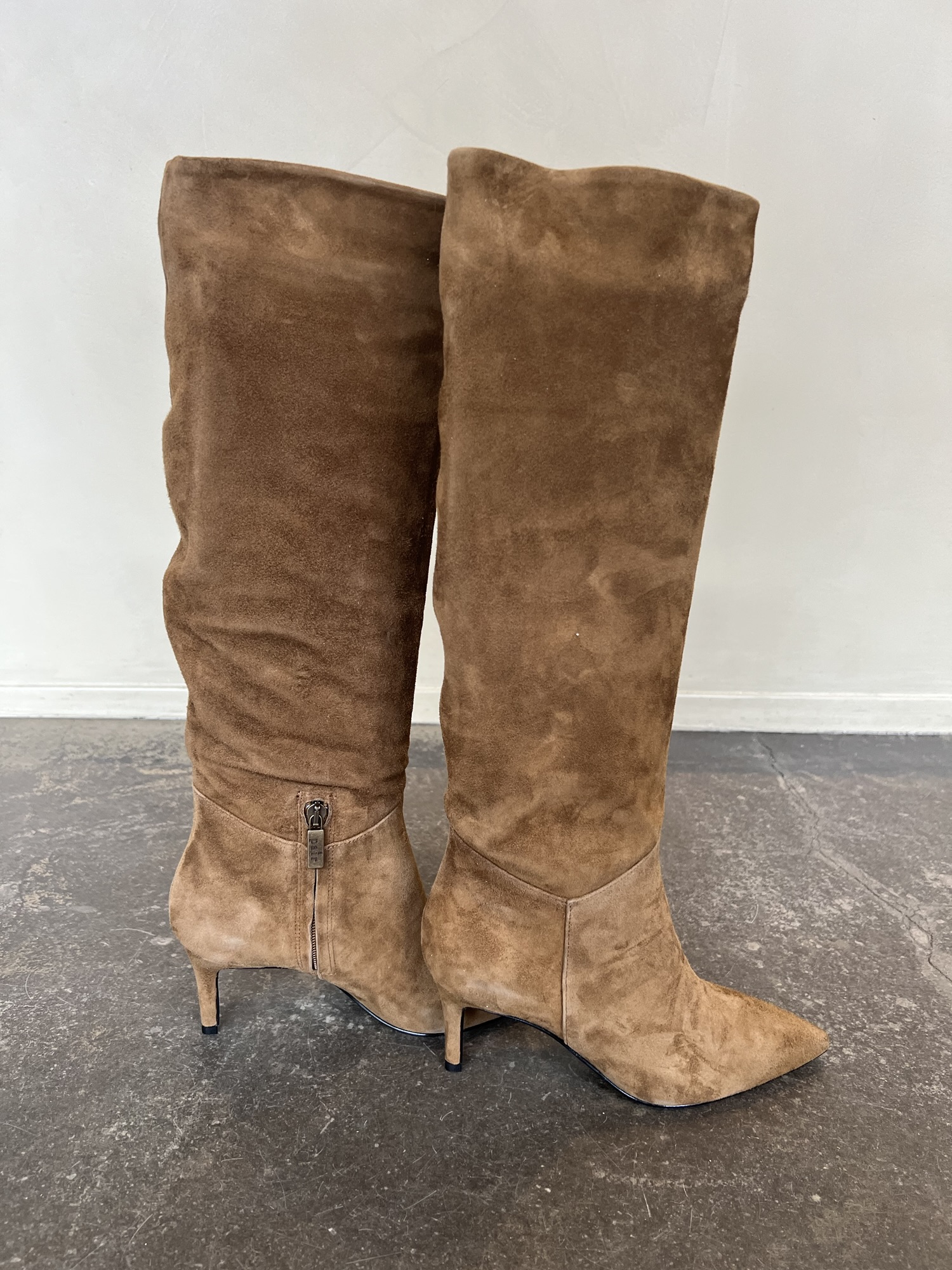 Elegant langskaftet støvle i ruskind med spids snude og kort lynlås på indersiden. Hælhøjden er ca 6,5 cm, så en støvle der er egnet til at bruge hele dagen. Denne støvle er perfekt til kjoler og nederdele.