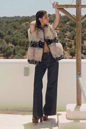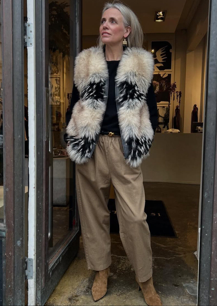 Vestens hovedmateriale er faux fur — og det føles ikke spor stift. Den imiterede pels er blød og har et flot to-tone mønster i beige og sort, der giver dybde og kant. De sorte kontrastkanter i imiteret læder skaber definition langs åbningerne og linjerne, og V-udskæringen sørger for en flatterende silhuet. Indeni gemmer sig en overraskelse: et panter-print foer, som gør, at vesten både føles luksuriøs og har den lille kant, man elsker i urbant design. Mes Demoiselles Paris