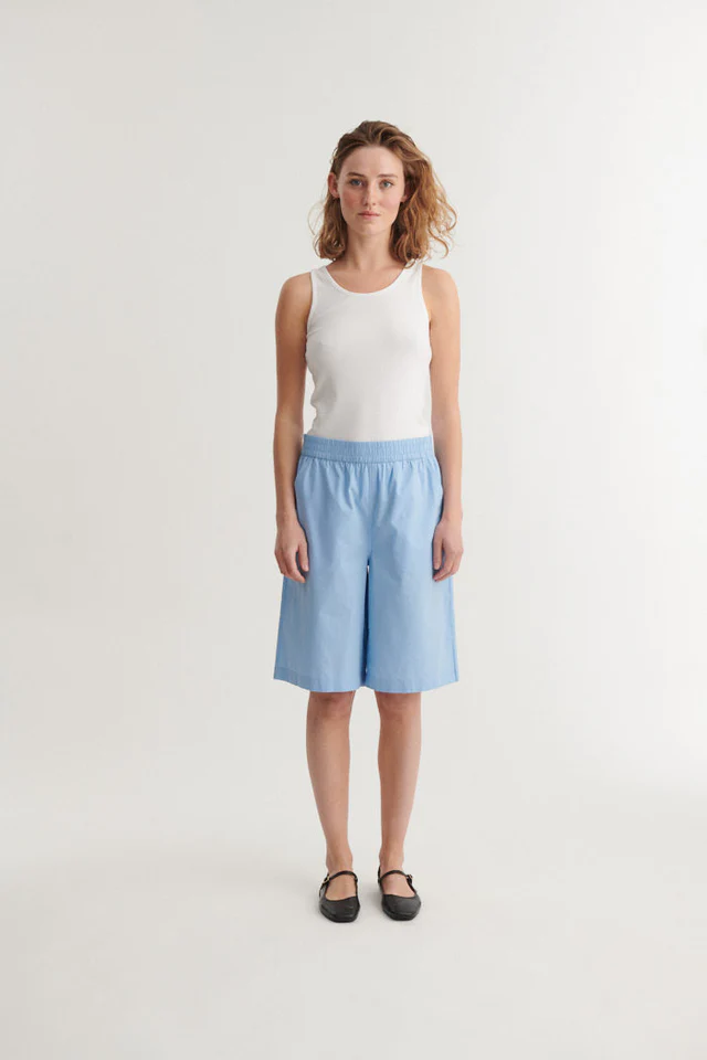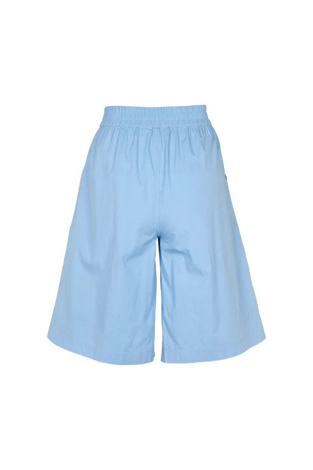 Basic Apparel Silje Bermuda Shorts Frosen Fjord i Lyseblå er et par lette shorts med elastik i taljen, skrålommer og et afslappet fit, der giver en behagelig og ubesværet fornemmelse. Den brede bundvidde skaber en rolig silhuet og gør shortsene nemme at bevæge sig i, ideelle til varme dage og afslappede hverdage.