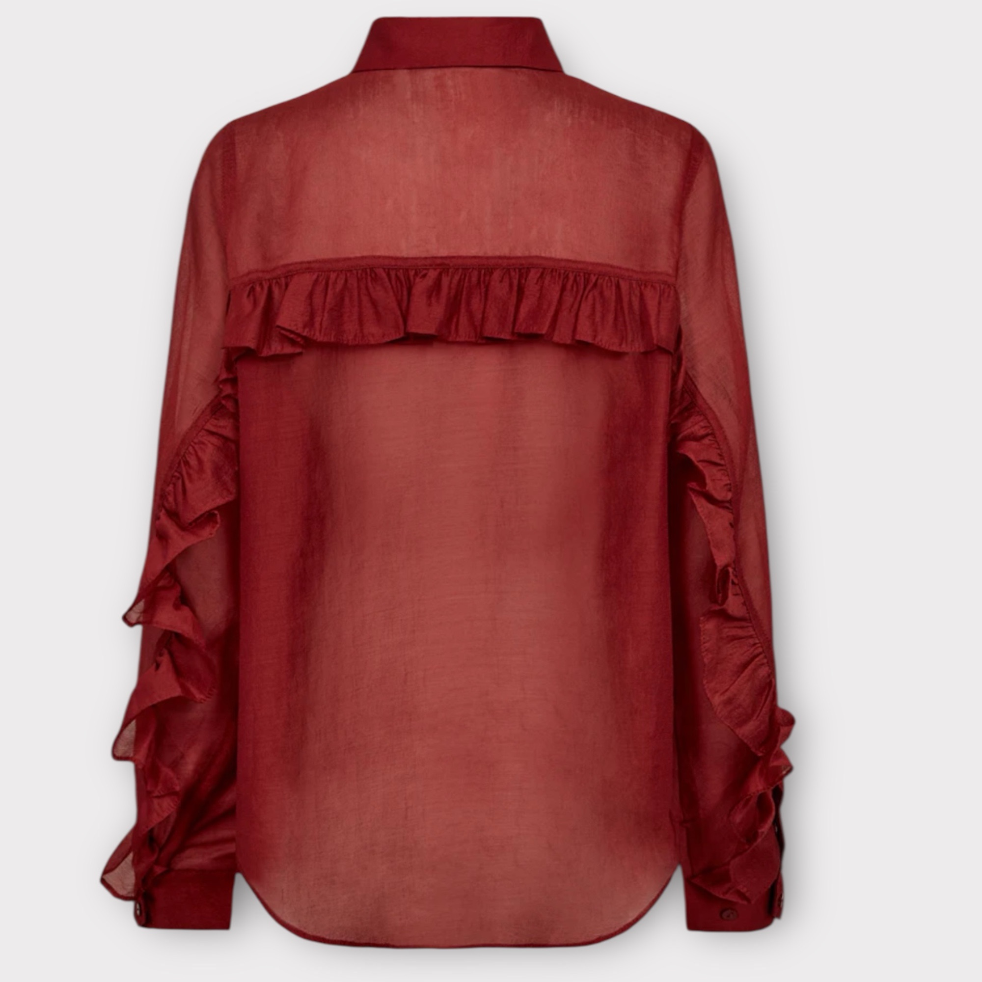 CMBLUEBELL-SHIRT er en langærmet skjorte i en eksklusiv, transparent kvalitet med en klassisk krave, skjult knaplukning på fronten, en løs pasform samt en bred flæse over ryggen og ærmerne, der giver et raffineret udtryk.