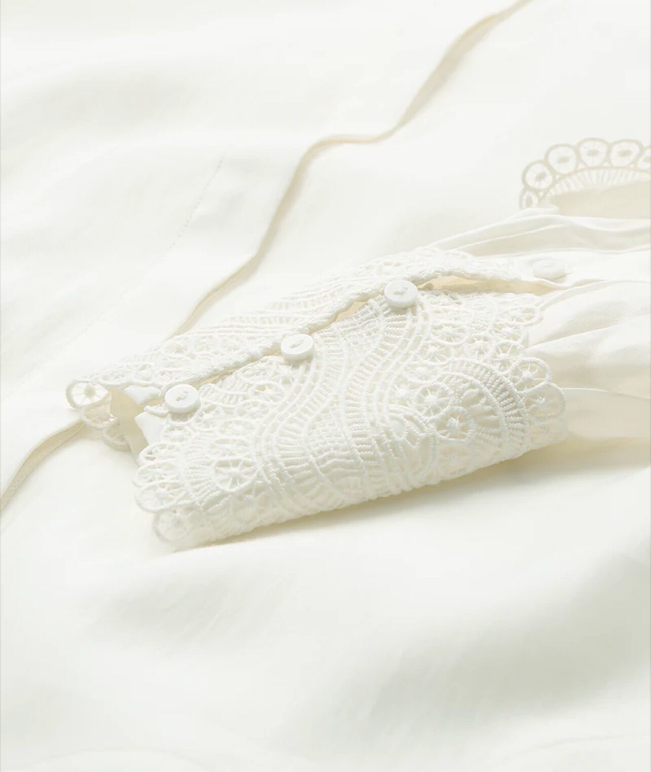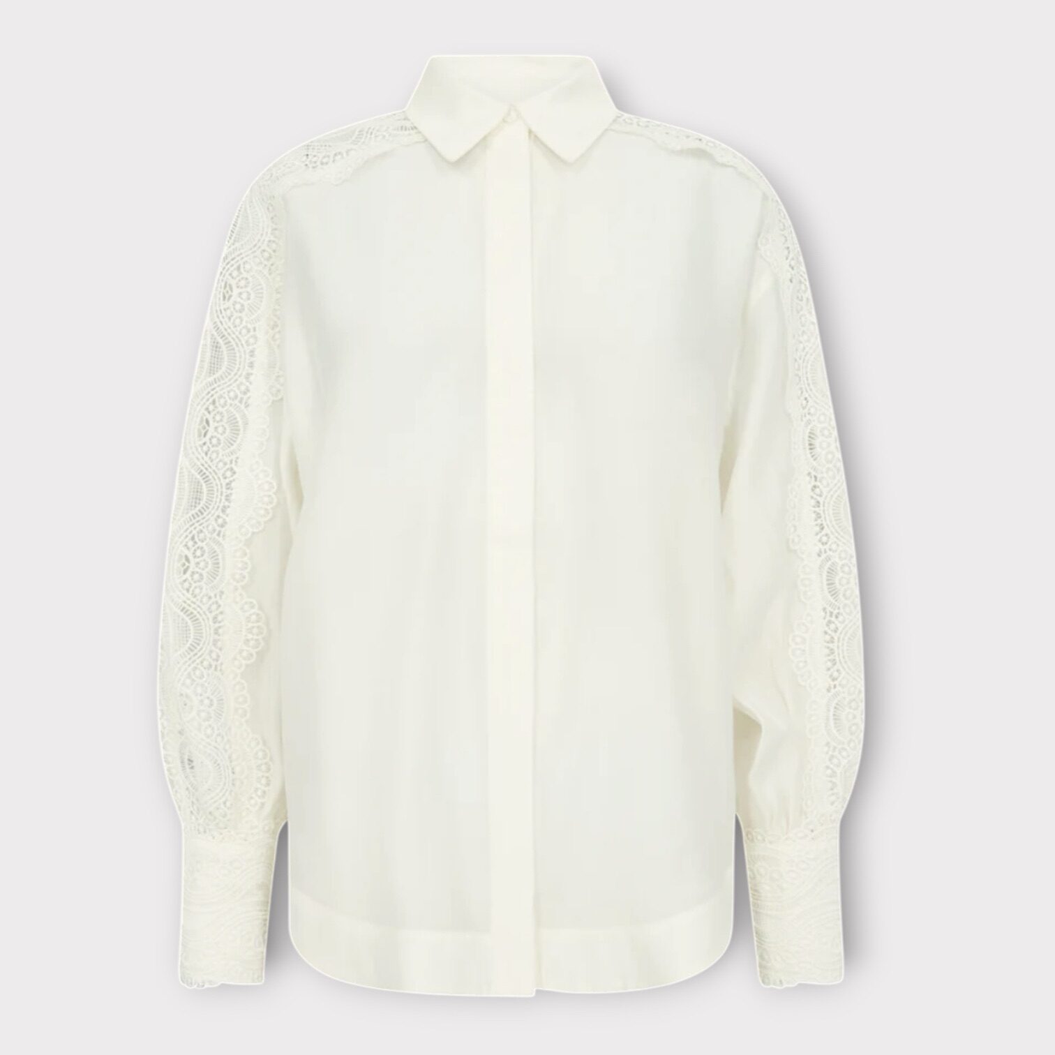 CMMOLLY-SHIRT er en skjorte i en eksklusiv kvalitet med lange ærmer med blonde cuffs, skjult knaplukning på fronten samt cut-and-sew blonder, der giver et elegant sneak peek til huden.