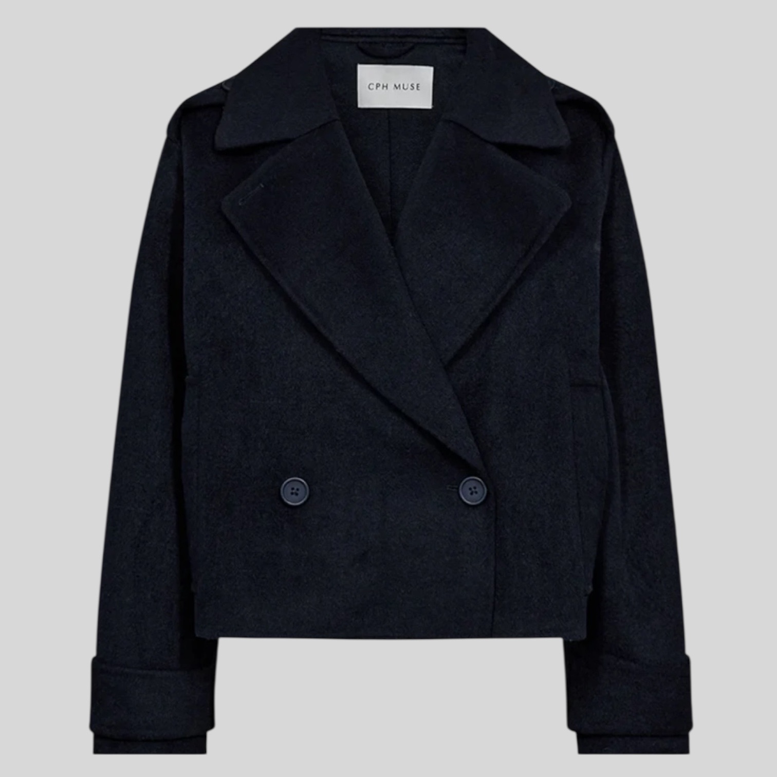 CMEMMA-JACKET er en lige, kort trenchcoat fremstillet i en vævet uldblanding med en blød, børstet overflade og raffineret struktur. Den dobbeltradede silhuet defineres af et markant revers med dyb udskæring og rene snitlinjer, mens skulderstropper og justerbare ærmestropper tilføjer skræddersyet karakter. Afsluttet med praktiske lommer, der fuldender det strukturerede udtryk.