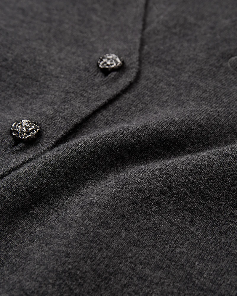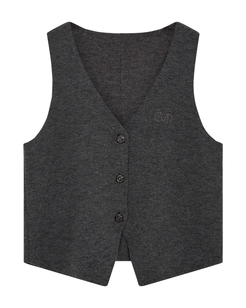 Copenhagen Muse Zina Waistcoat er en strikket vest i en eksklusiv kvalitet med en dyb V-udskæring, en regulær pasform, stilfulde knapper på fronten samt en broderet logodetalje på brystet.
