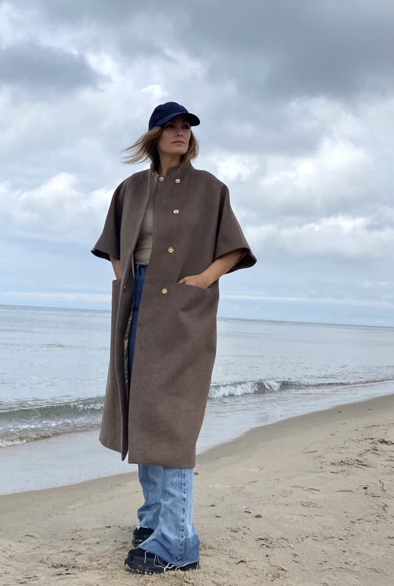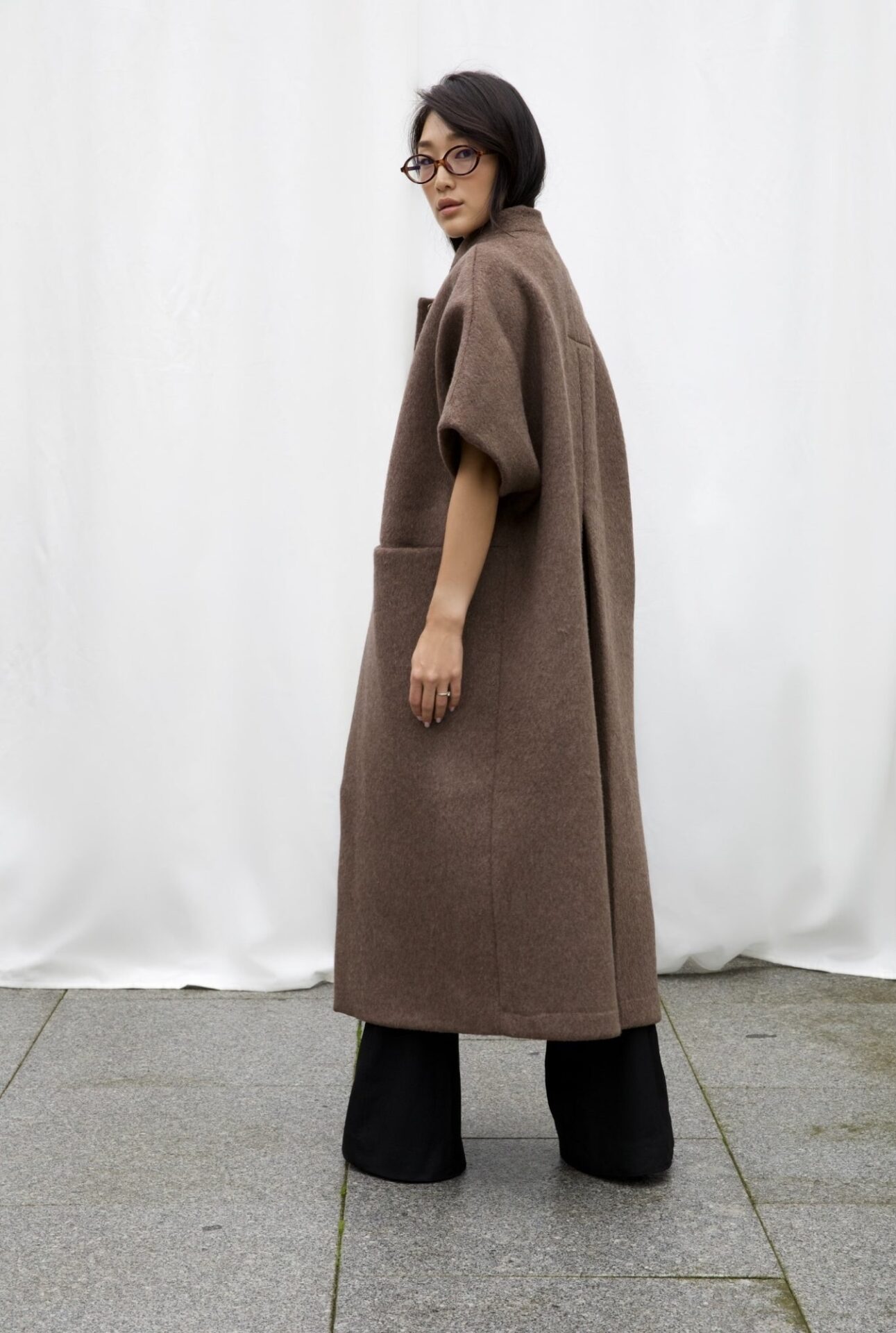 Frakke i uldblanding i én størrelse med afrundet mandarin-krave, korte, brede ærmer og klassisk skjult knaplukning. Forlommer og høj, elegant slids bagpå. Mok-frakken er designet med en oversize pasform, hvilket gør den perfekt til lag-på-lag og fuldender et chic og behageligt look.
