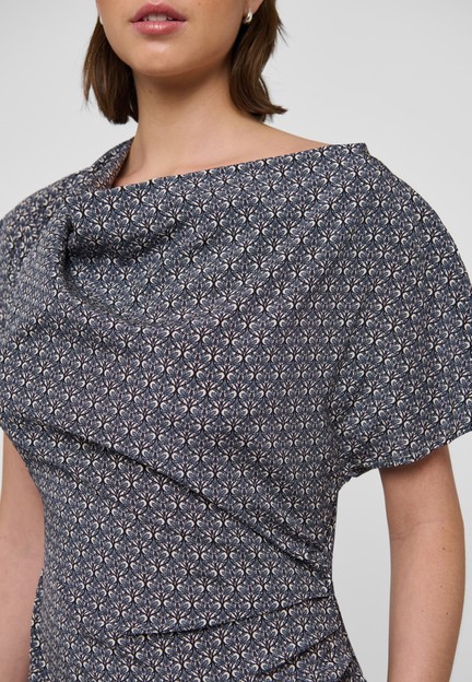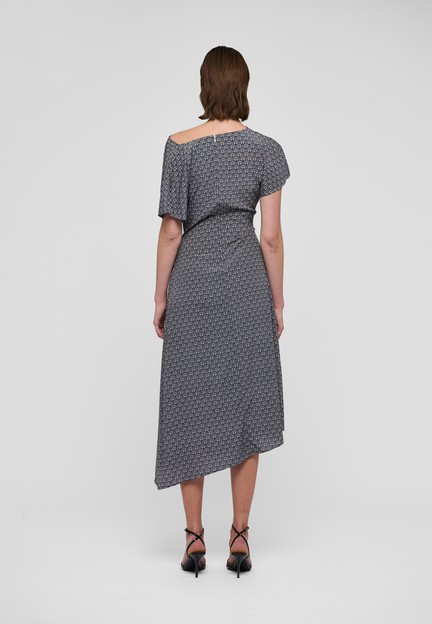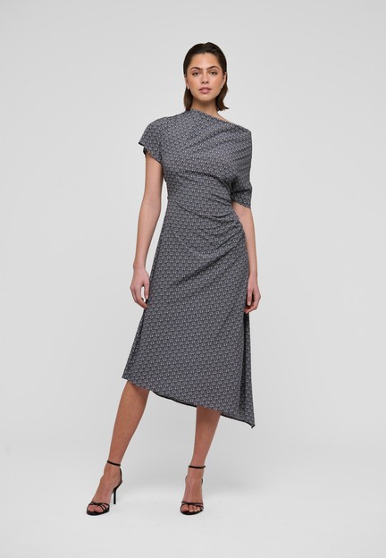 Elegant og super chic mønstret kjole med en tydelig og raffi profil. Denne smukke silkekjole med et lille blomsterprint smyger sig om kroppen med drapering ved halsen og på den ene hofte, før den afsluttes med en asymmetrisk kant ved midt på læggen. Brede ærmer giver den et ubesværet cool look.
