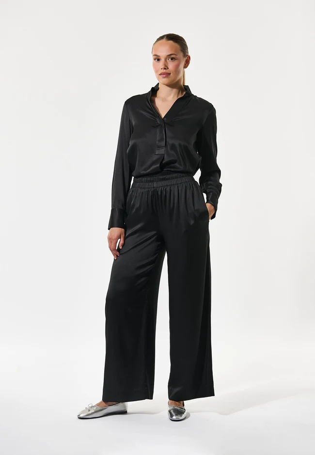 Dea Kudibal Margodea Bukser Black er et par bukser med vide ben i silke, og det er en DEA KUDIBAL-klassiker. Dette par i sort med en bred elastisk linning er god at have i din garderobe. Brug dem med en simpel top eller en strik for et comfy og klassisk look.