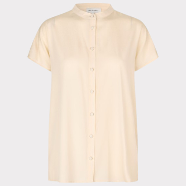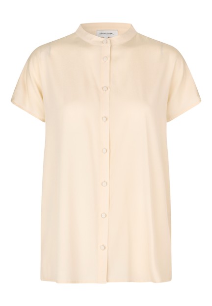 Dea Kudibal VidaDea Skjortebluse Leche er gennemknappet med en lille kinakrave og har korte ærmer, der lægger sig fint om skulderen, hvilket gør Kudibal blusen velegnet til både kontor og hverdagsbrug – eller som et stilrent valg under en blazer.