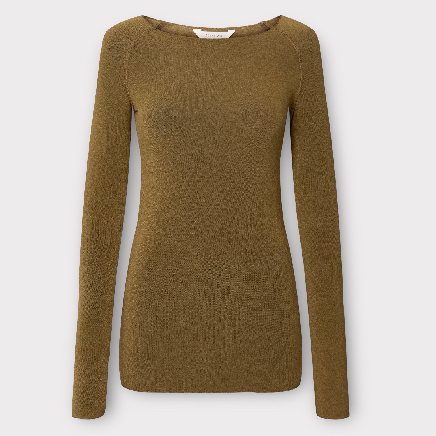Vores langærmede Amalie tee shirt er vores absolutte favorit. Tee shirten er lavet i en blød uld- og viskoseblanding. Amalie har bådhalsudskæring og en tætsiddende pasform.