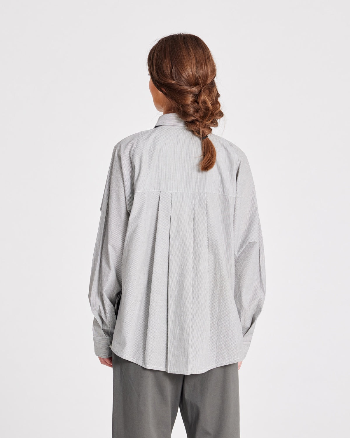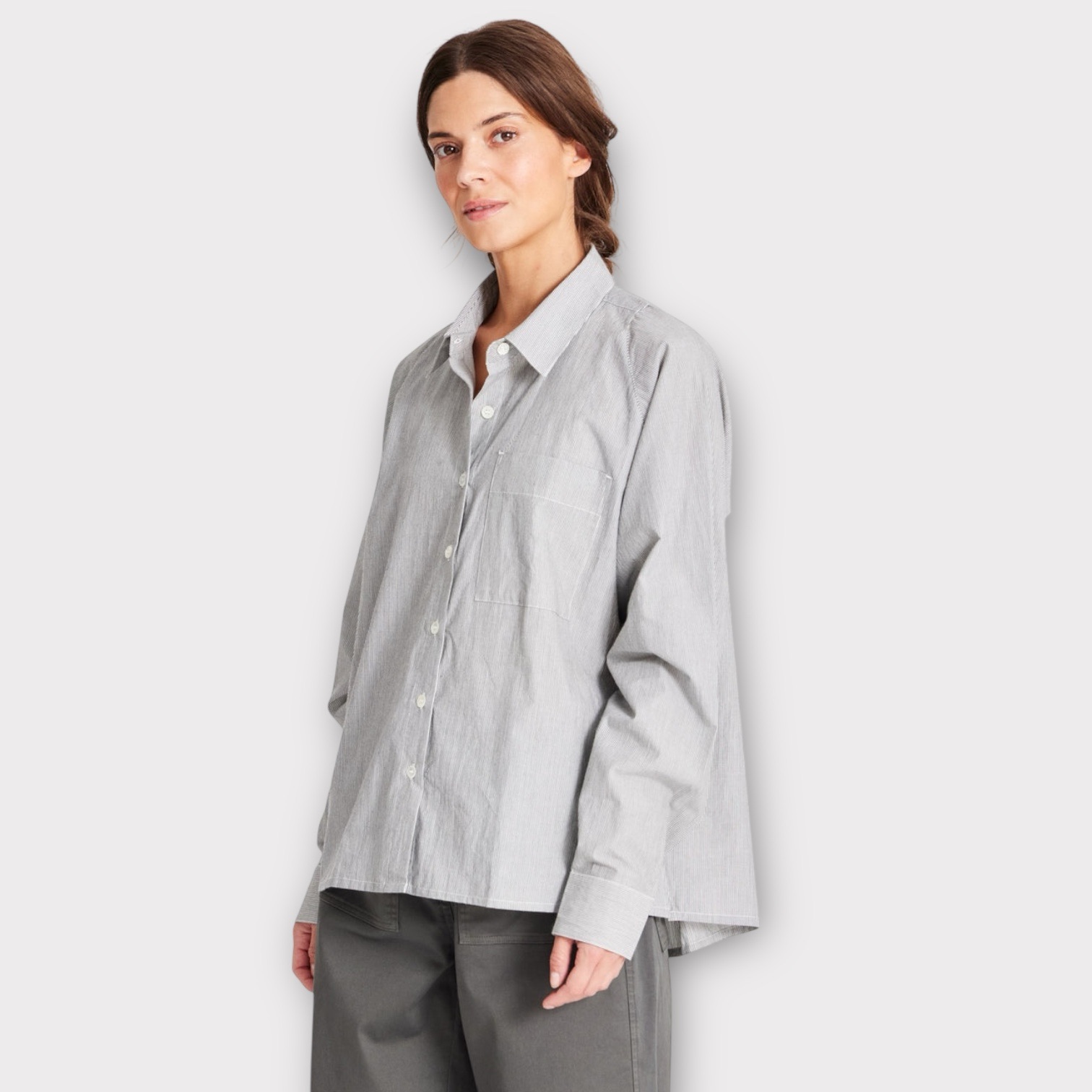 Bella er en stribet skjorte, som er lavet af 100% økologisk bomuldspoplin. Skjorten har raglanærmer, brystlomme samt knapper foran og på manchetter. Bella har plisseringer bagpå, slidser i siderne og er længere bagpå.