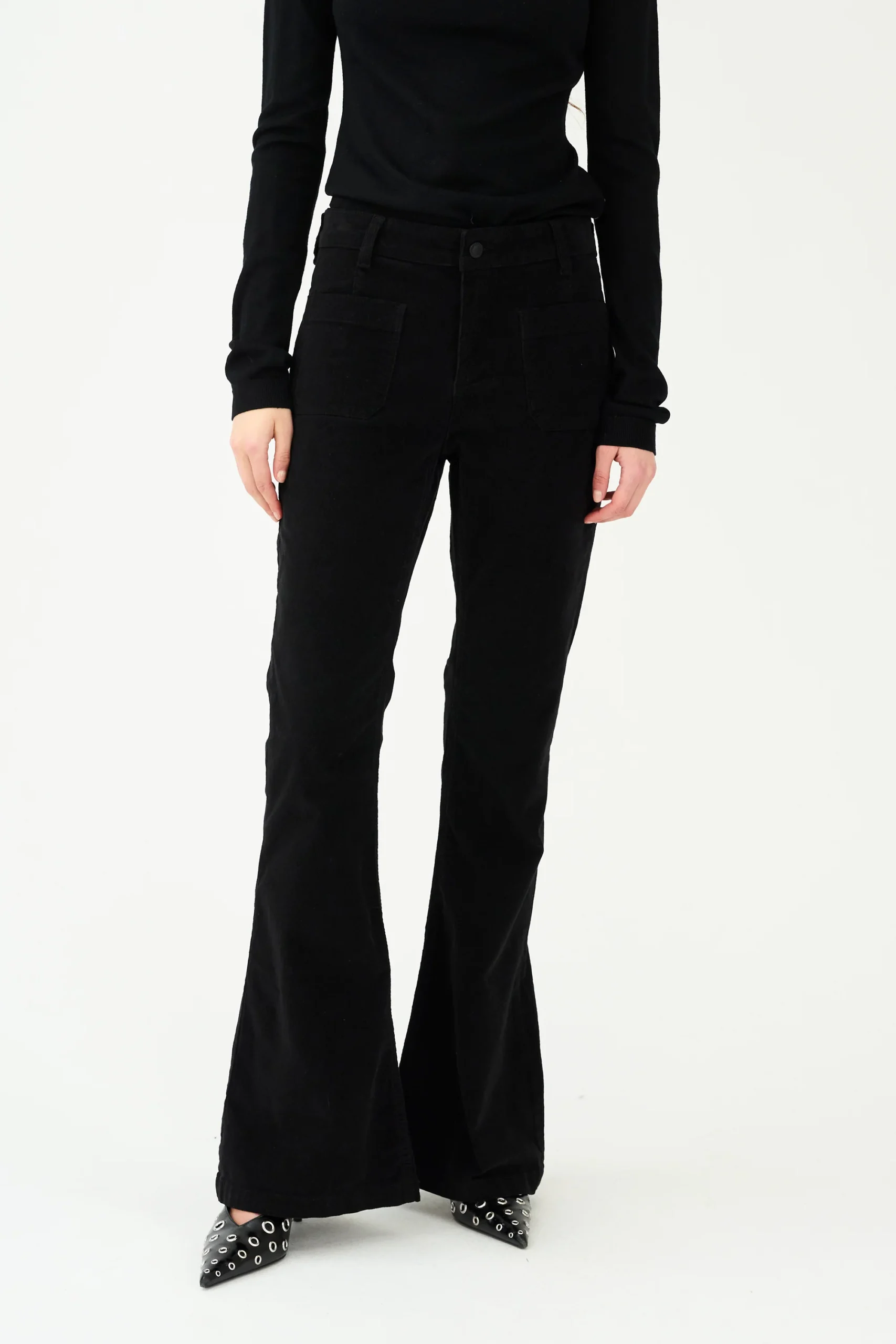 Disse jeans har en mellemhøj talje, skinny pasform og tydelige vide ben, hvilket skaber en svunget silhuet, der er både modig og stilfuld