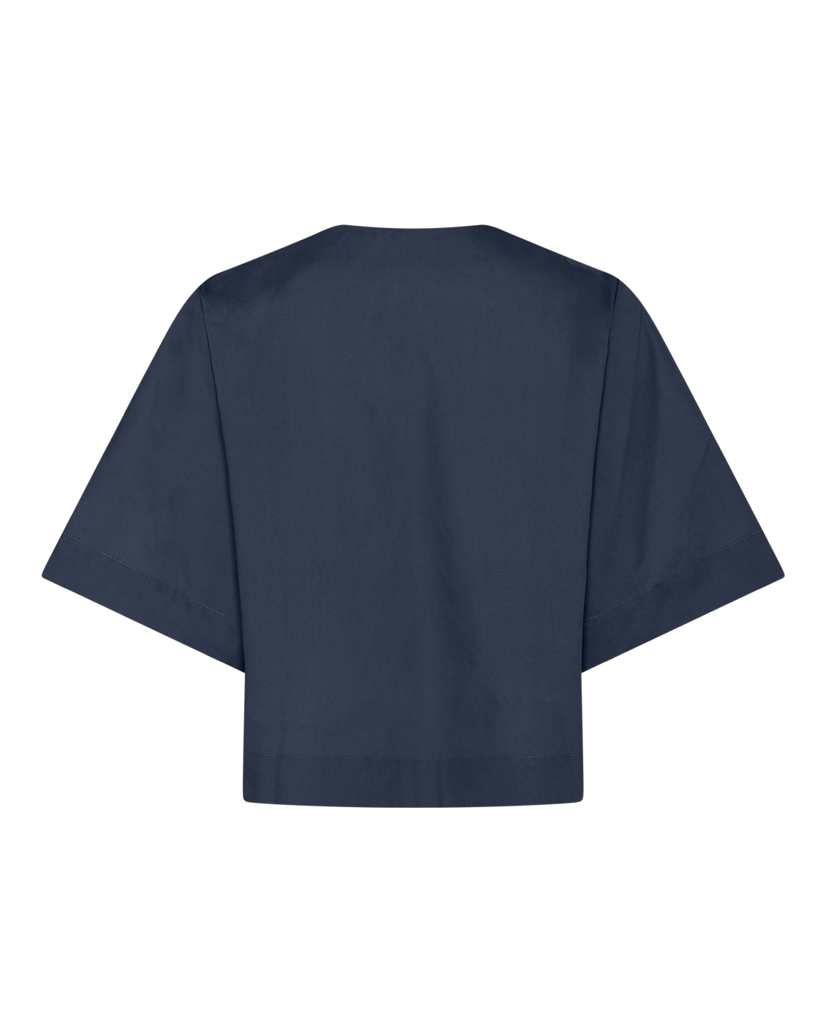 Blusen har brede, korte ærmer og en løs pasform, som giver en ubesværet silhuet. Slå-om-detaljen foran tilfører et diskret, feminint twist, mens det enkle design bevarer et rent look.
