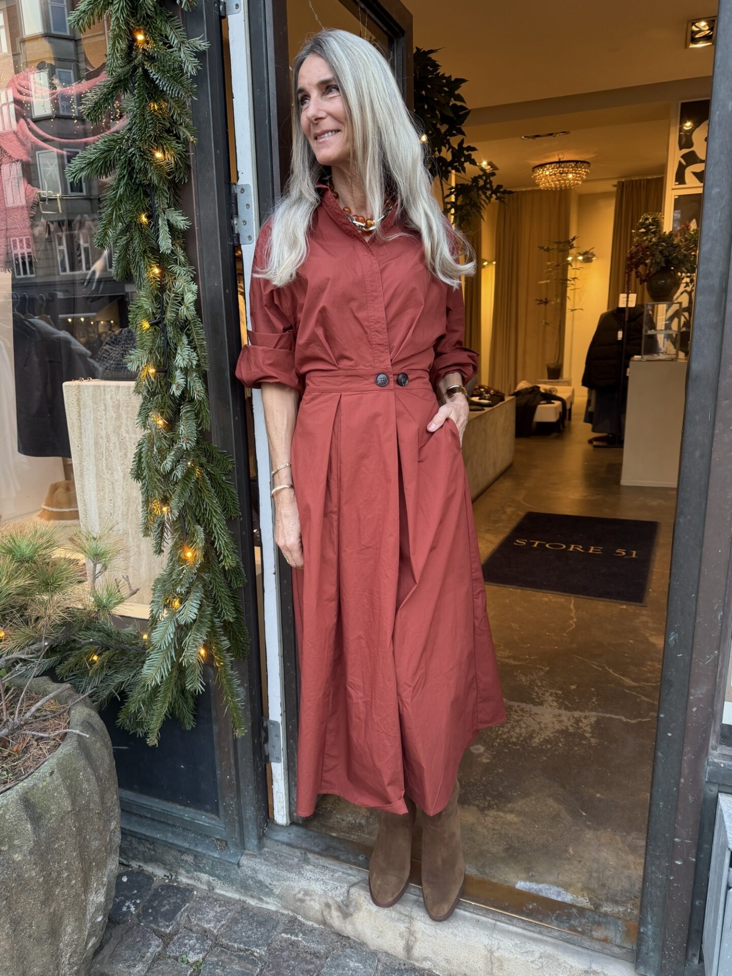 La Rouge Pia Dress Terracotta er skabt til kvinder, der gerne vil se velklædte ud uden at gøre det kompliceret. Den V-formede skjortekrave giver et elegant udtryk, mens den skæve knaplukning tilfører kant og karakter. Det er netop detaljerne, der gør, at kjolen skiller sig ud – uden at larme.
