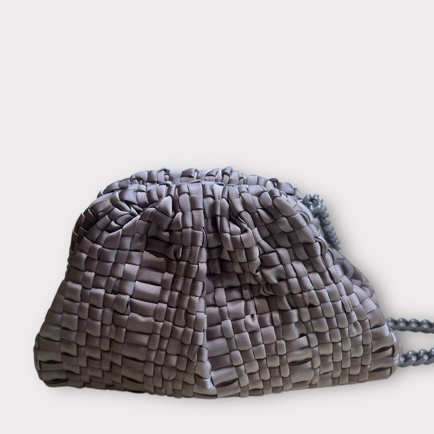 Lille dameclutch i vævet båndstof, håndlavet på gamle væve. Denne enestående, reducerede version af den ikoniske Maria La Rosa-taske er rummelig nok til at bære det vigtigste med dig. Perfekt til alle årstider og et symbol på en ny, urban elegance. Den er udstyret med en ton-i-ton kæde, så den også kan bæres over skulderen, og fås i mange farvevarianter: fra naturlige til fluorescerende nuancer, samt mørkere toner som skovgrøn og sort.
