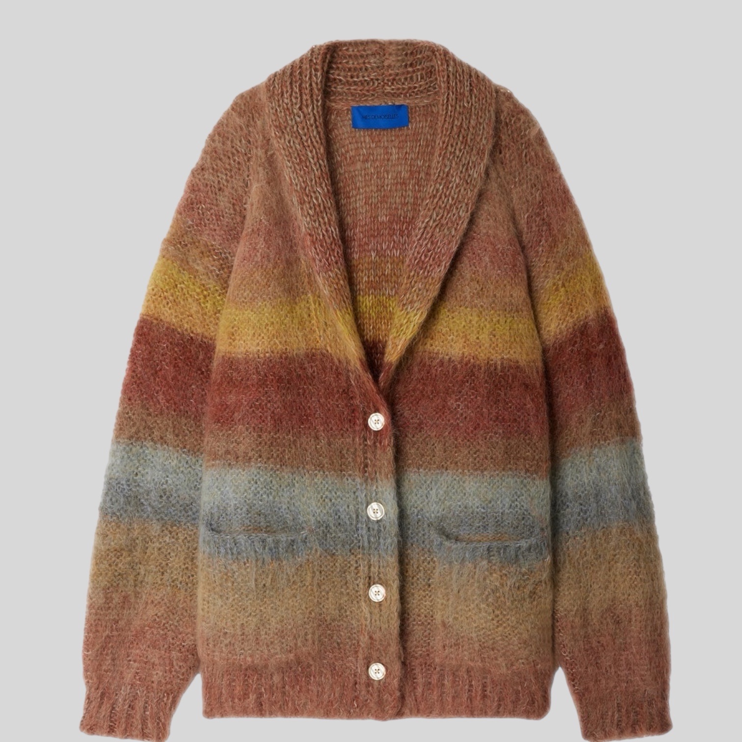 Håndstrikket med traditionelle teknikker fascinerer denne børstede mohair-cardigan med sin bløde, fløjlsagtige tekstur og flerfarvede gradient i varme, naturlige khaki- og okkertoner. Den komfortable sjalskrave, raglanærmer og påsatte lommer gør den både praktisk og elegant. Den lukkes med en knapstolpe og tilfører ethvert outfit et autentisk og lyst udtryk.