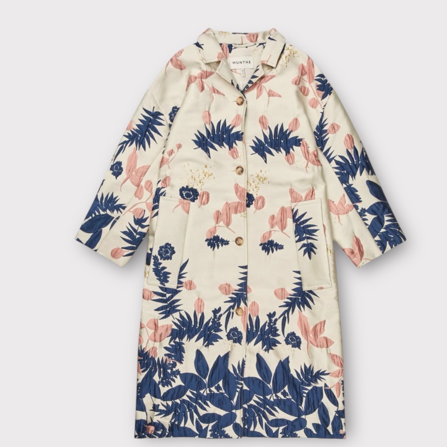 Denne frakke har en løs paform, knaplukning, krave og to store frontlommer. Frakken er designet med et kunstnerisk botanisk broderi i kontrastfarver, der tilfører et unikt præg.
