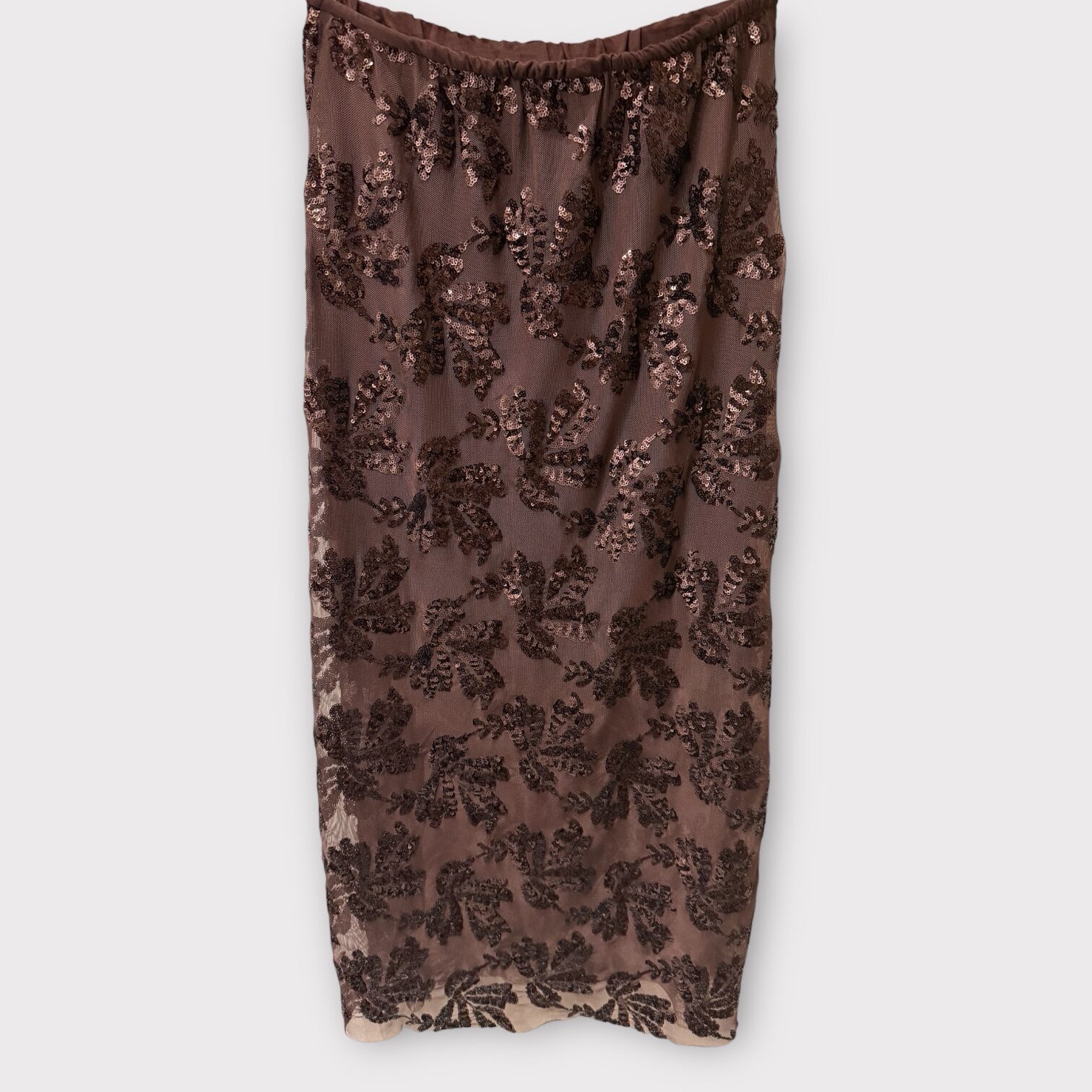 Smuk brun fest nederdel med brune palietter tone i tone. Nederdelen har en tynd elastik i taljen og er onesize. Den passer str S/M/L
