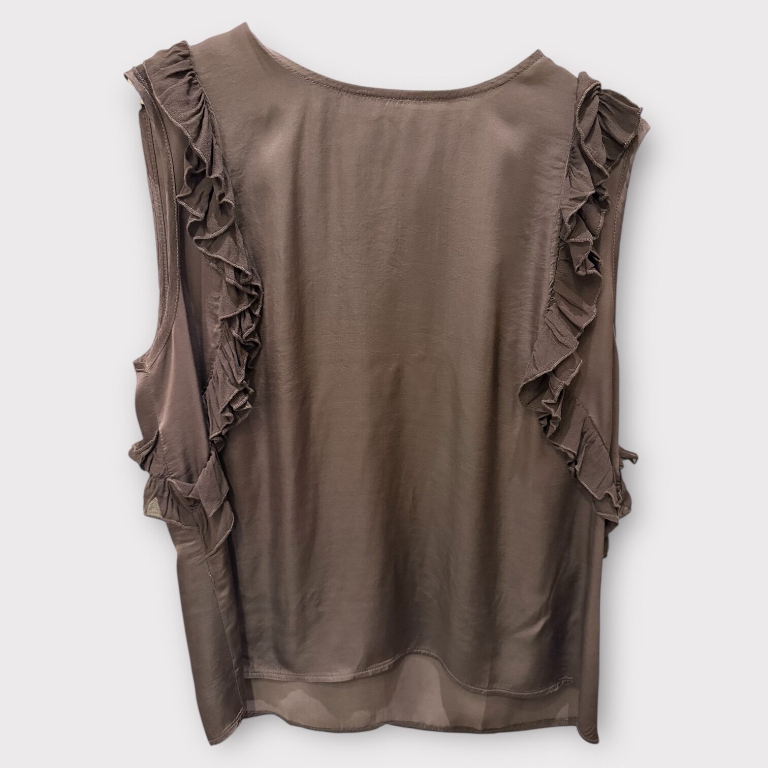 Top i ren viskose med flæser ned langs siderne i viskose crepe. Toppen lukkes med en knap i nakken.