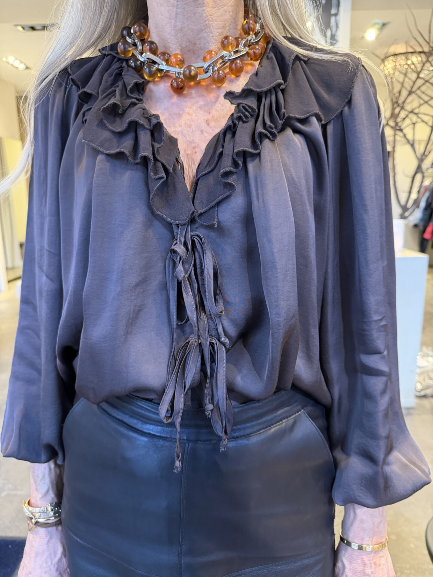 Smuk viskose bluse med flæser af crepe viskose tone i tone i den smukkeste mokka brune farve.
