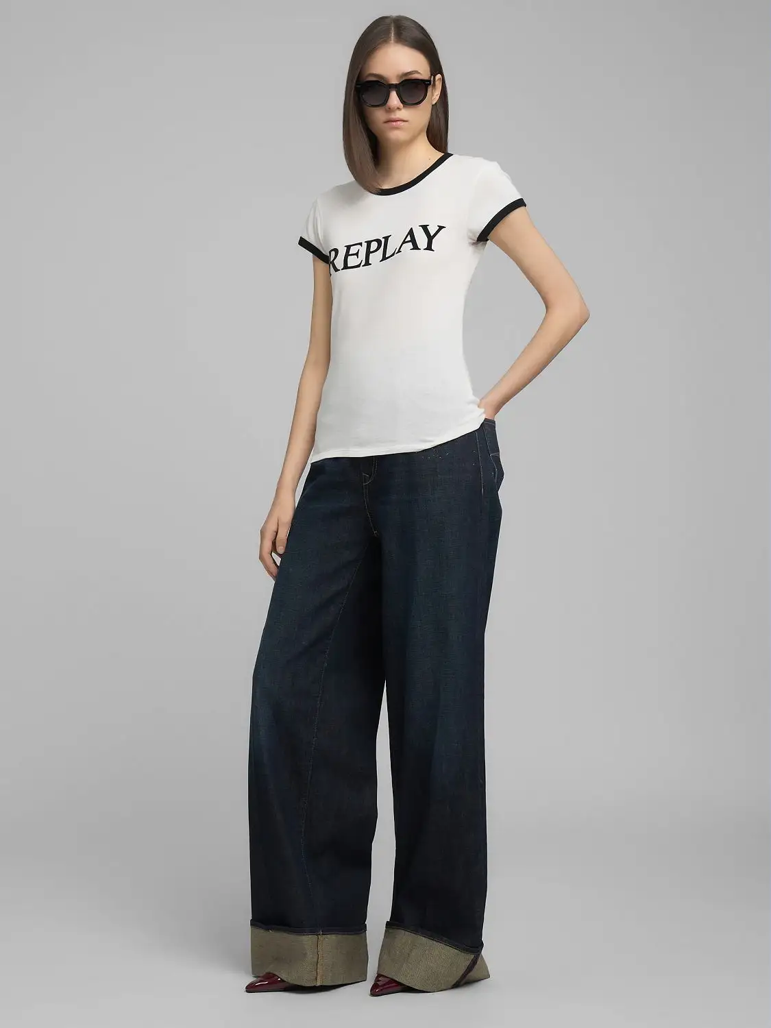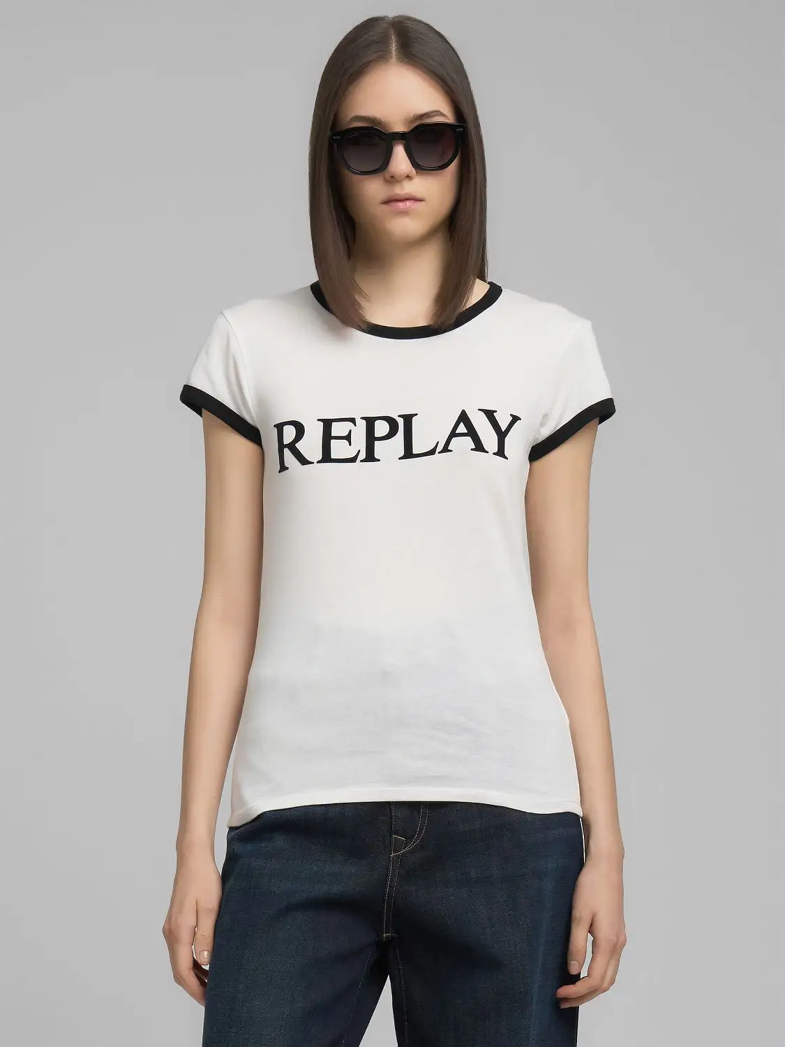 Slim-fit crew-neck T-shirt in soft raw cotton jersey. This short-sleeved style features the Replay maxi-lettering printed on the front and a contrasting neck and sleeve trim
