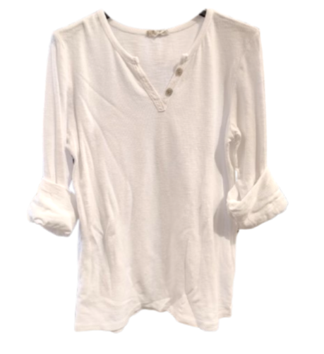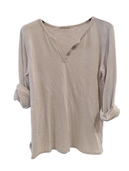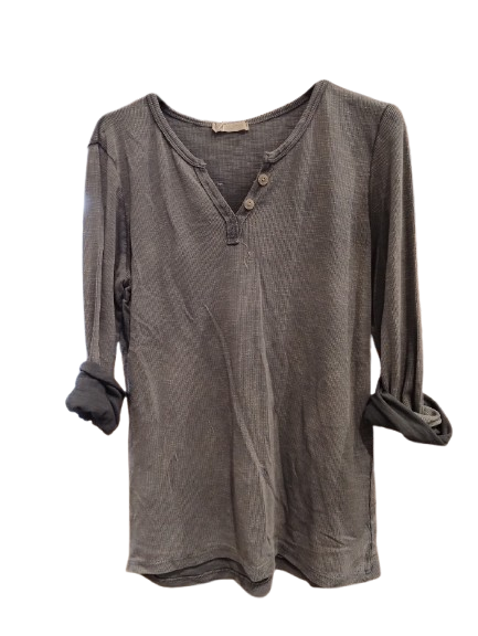 Det ribstrikkede materiale giver T-shirten en flot struktur og et moderne twist på den klassiske basic. Stolpelukningen foran tilfører lidt ekstra kant — den gør T-shirten mere end bare en basisdel, den bliver en del af dit outfit i sig selv.