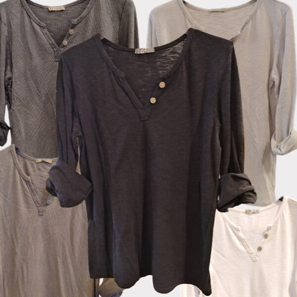 En hverdagsfavorit, som både kan trækkes over hovedet når der skal hygges igennem derhjemme og som kan knække det formelle med lag på lag i mormorstilen, eller den brug den med jeans og sneaks til de helt afslappede slentreture. Ribstrikket T-shirt med stolpelukning i fem forskellige farvereret af vores egne produkter, hvorfor vi kan holde et vågent øje med kvalitet og levering.