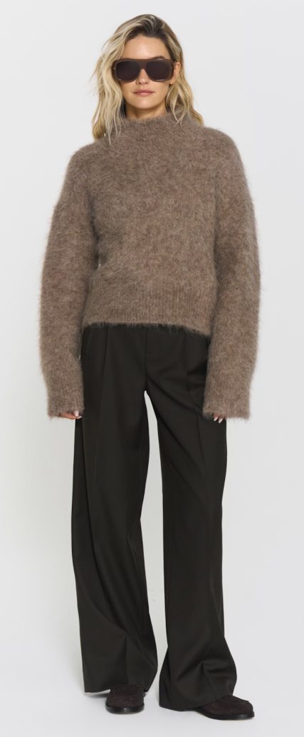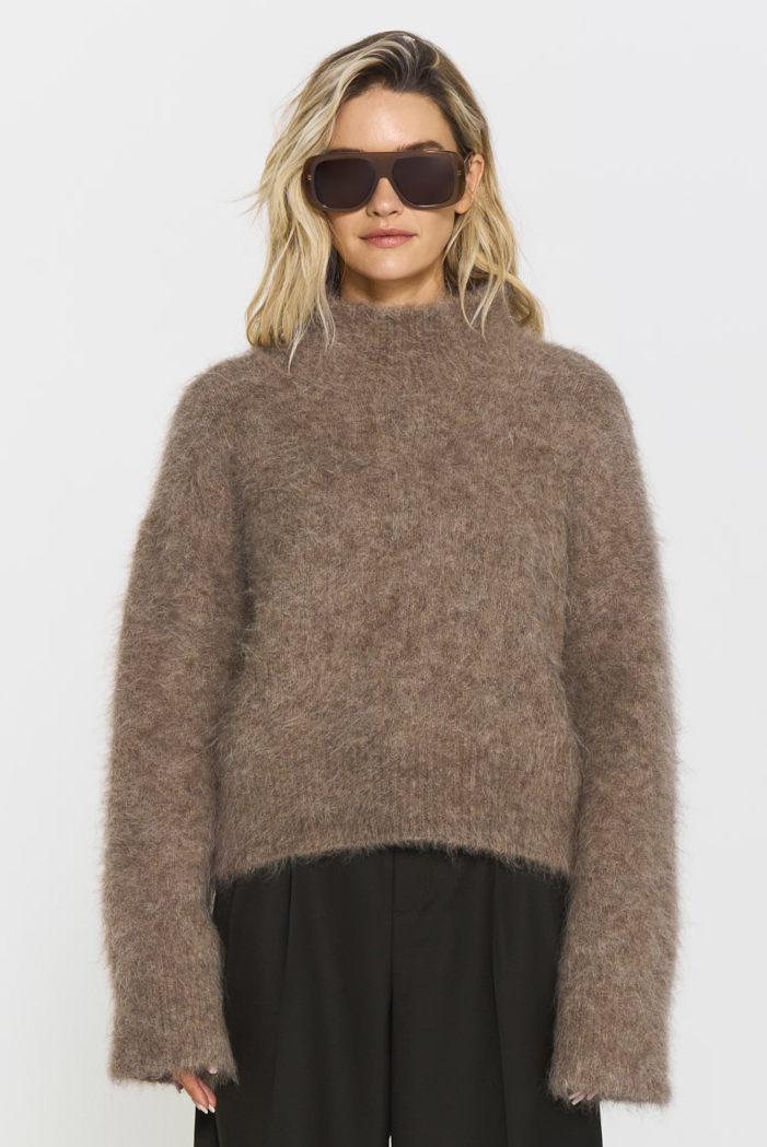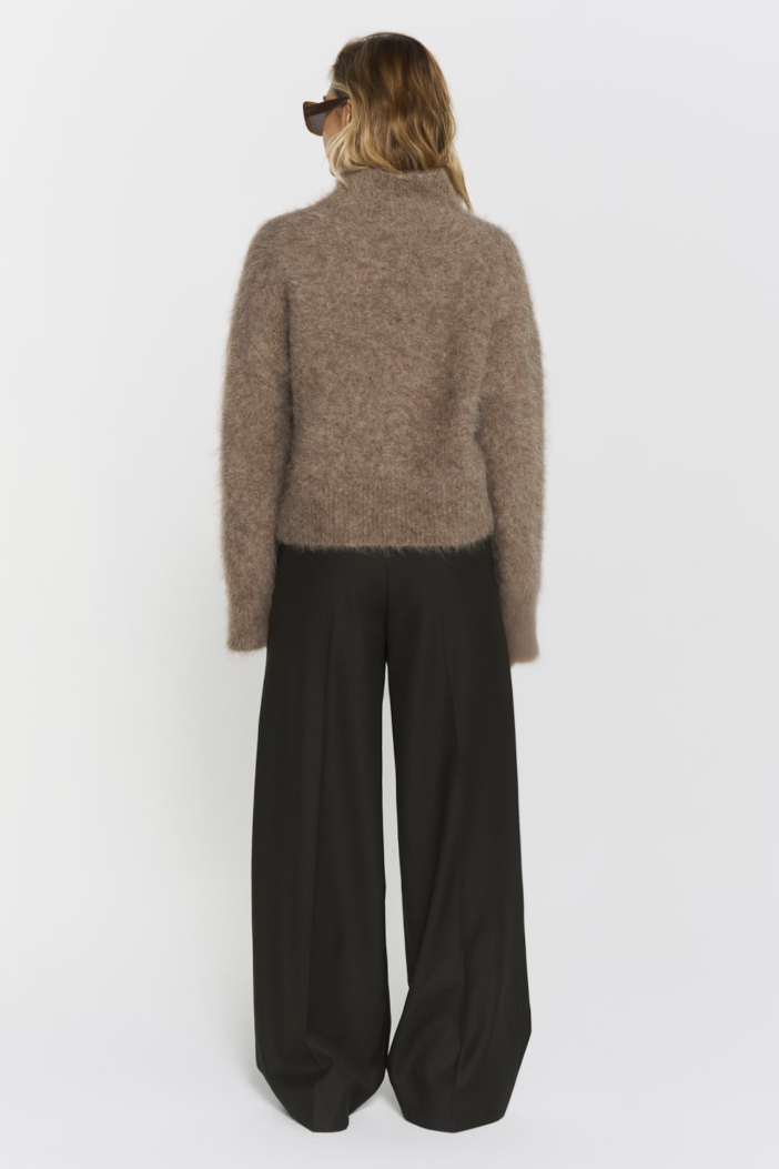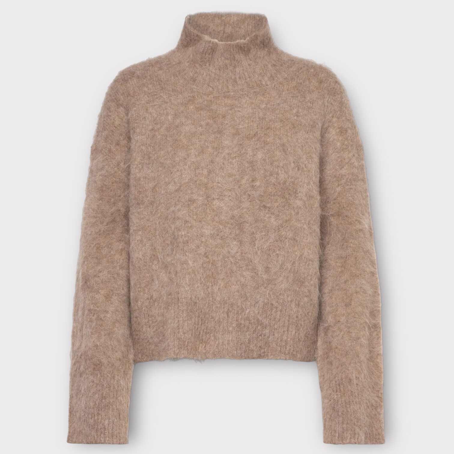 Ritva Knitted Sweater i farven hazelnut er din favorit til hyggelig og behagelig komfort. Strikket af en luksuriøs alpakablanding med en blød, børstet tekstur, der føles blid mod huden, samtidig med at den holder dig varm på køligere dage. Den afslappede rullekrave og raffinerede ribdetaljer giver et strejf af struktur til dens ellers afslappede silhuet. Perfekt til lag-på-lag eller alene. Modellen er 171 cm høj og har størrelse S/M på.