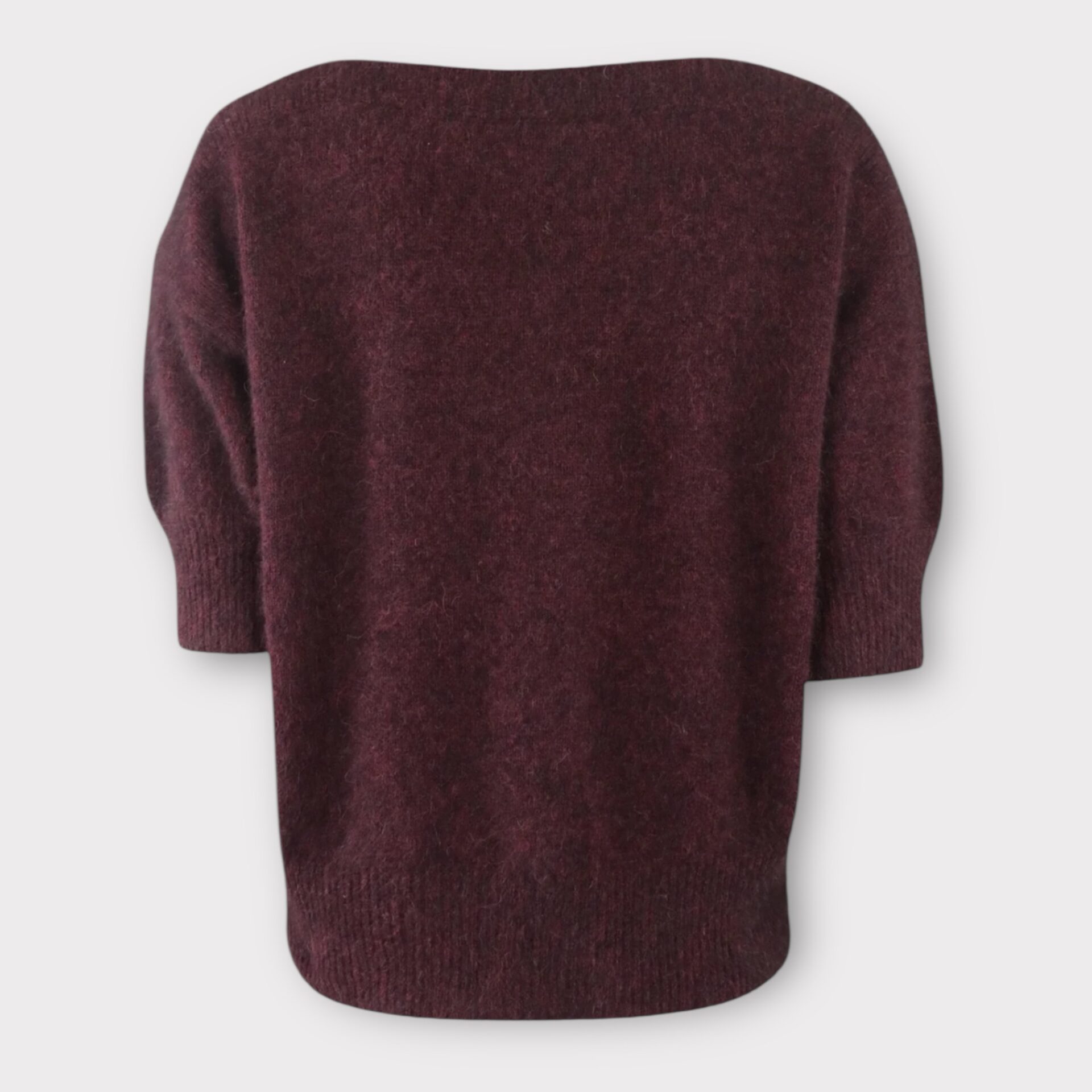 Six Ames Moi Redwine Melange er en tidløs sweater i 100% ultrablød vaskebjørneuld med en løs pasform og en elegant rund udskæring. De albuelange ærmer og ribdetaljer ved halsudskæring, kant og manchetter tilføjer en diskret struktur. Luksuriøst blød og let, med varme og komfort med et let og raffineret look.