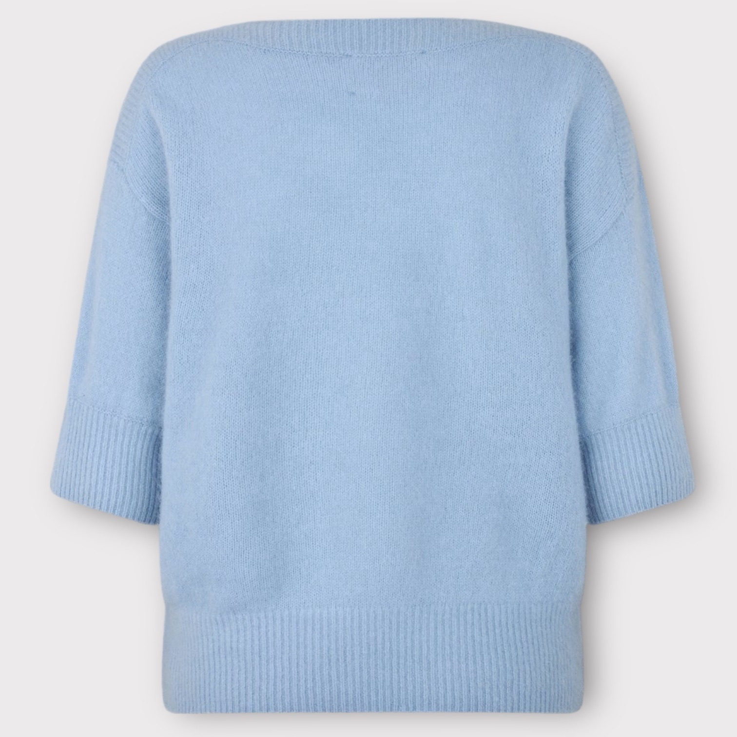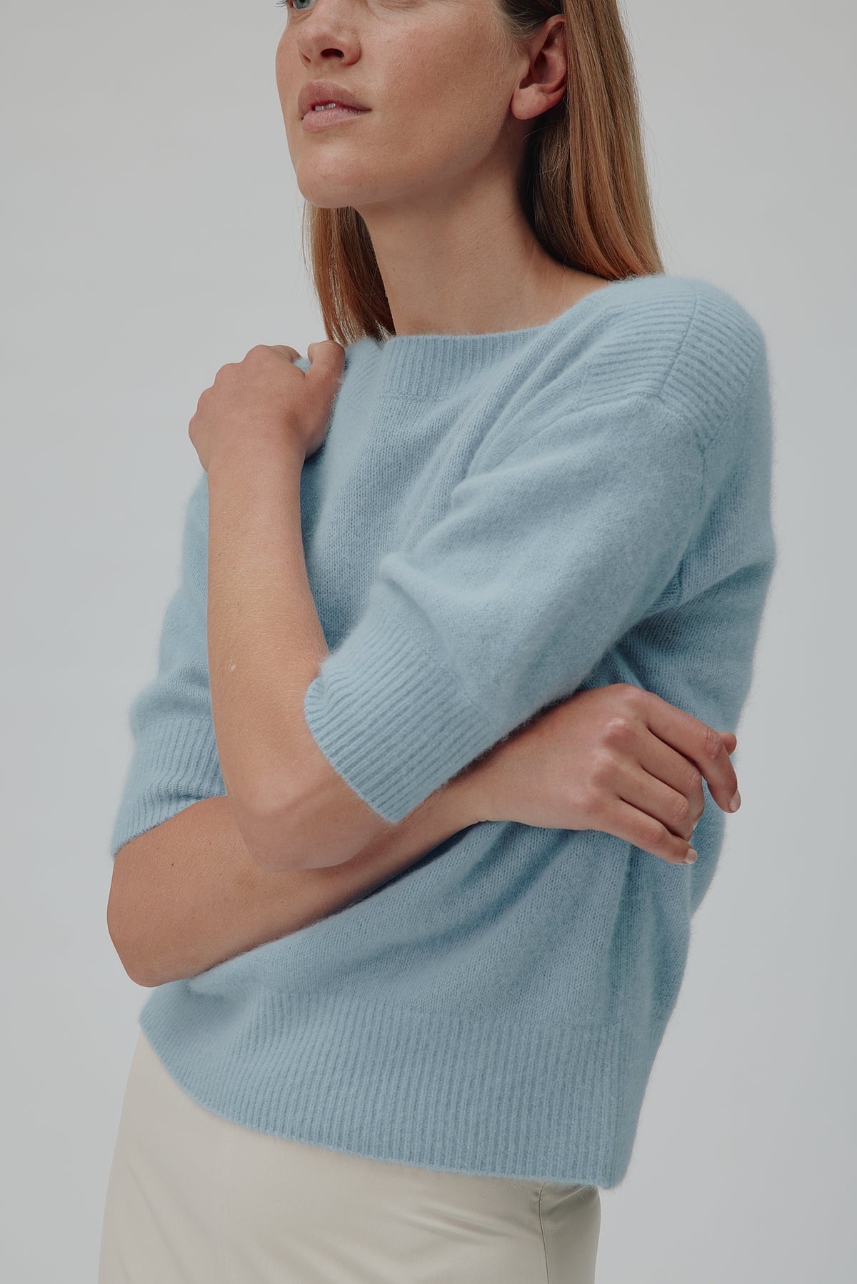 Moi er en tidløs sweater i 100 % ultrablød vaskebjørnsuld med en løs pasform og en elegant bådudskæring. De albuelange ærmer og ribdetaljerne ved halsudskæringen, kanten og manchetterne tilføjer en diskret struktur. Luksuriøst blød og let giver den varme og komfort med et ubesværet raffineret udtryk.