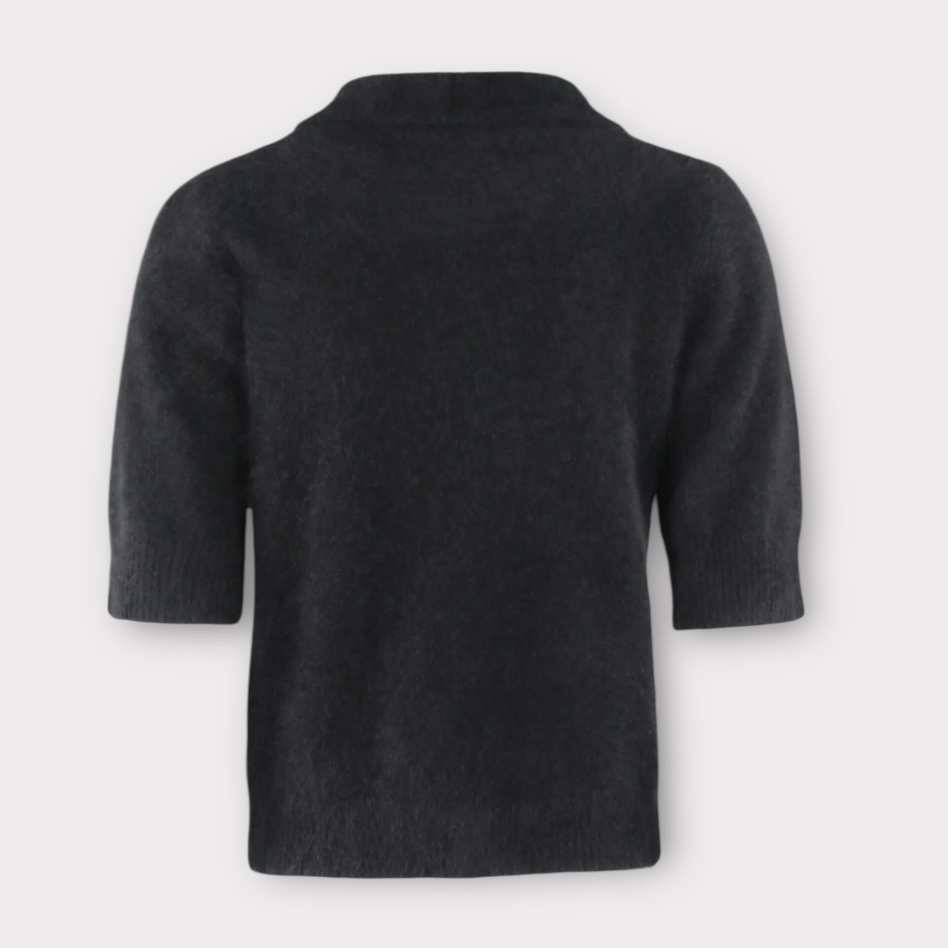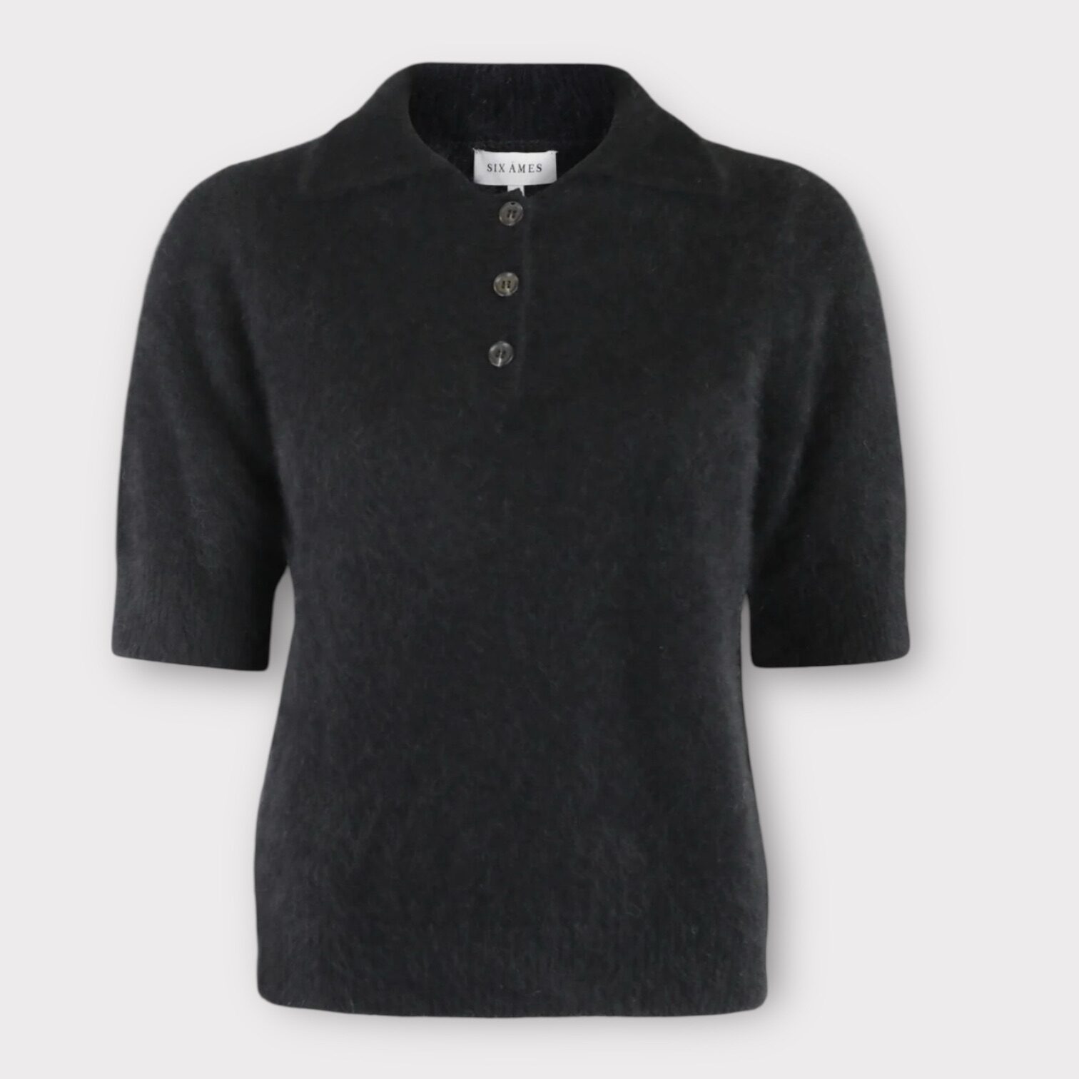 Six Ames Ricca Black er en kortærmet cardigan i 100% ultrablød vaskebjørneuld med tre knapper foran. Den har en lige pasform og fin ribkant ved halsudskæring, ærmer og forneden. Et tidløst og elegant stykke tøj, der ubesværet går fra kontor til aften.