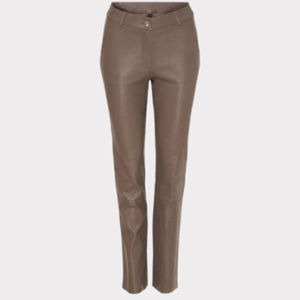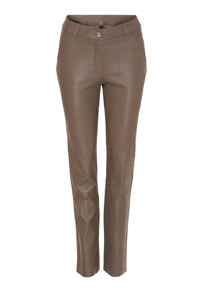 Skindbuks med lige ben i farven taupe og saddle back i smidigt læder. Gylp med lynlås og knap. Har skrå sidelommer, dekorative sømme under knæene og rå kant forneden.