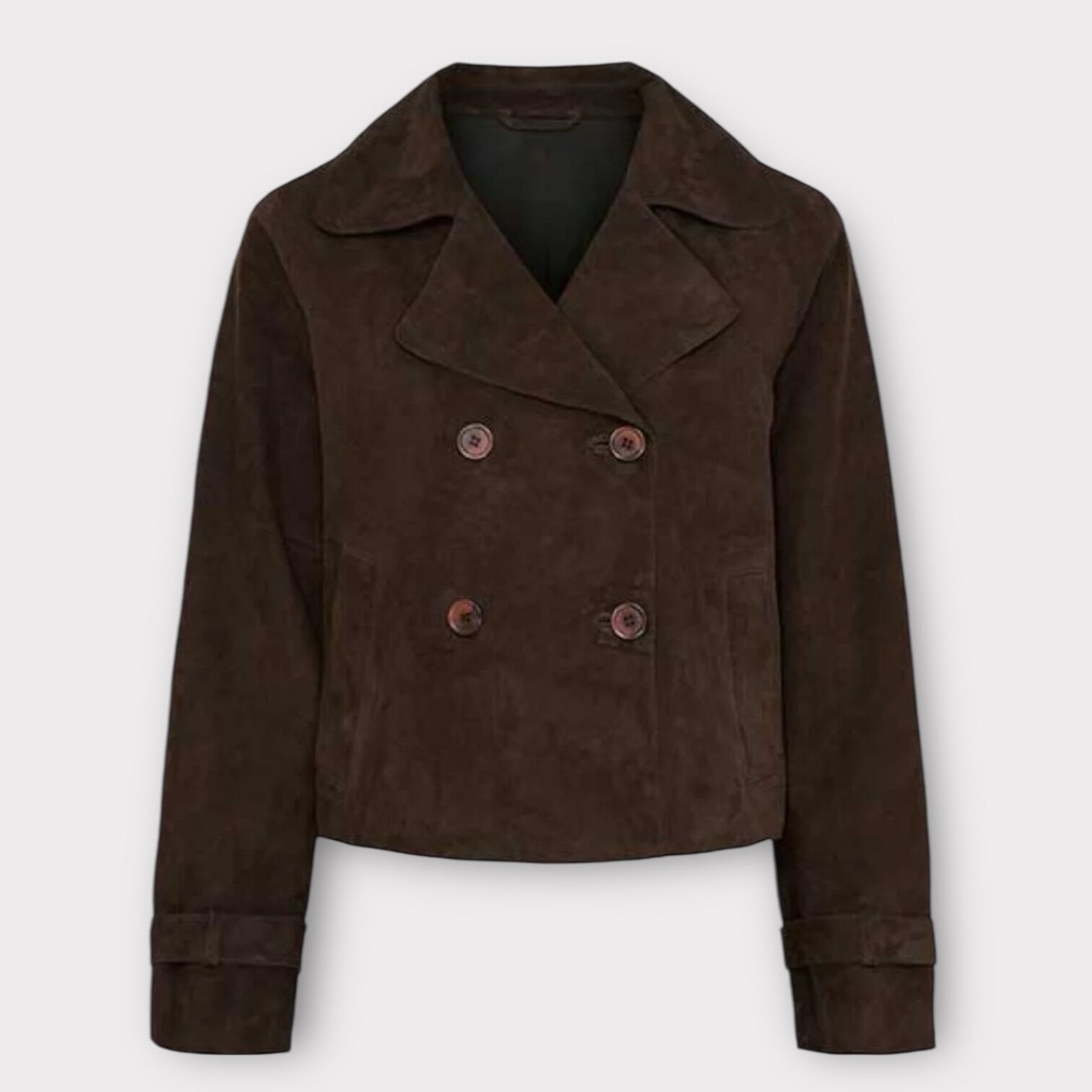 Skøn kort trenchcoat i en lækker mærkebrun ruskind. Jakken har en flot krave og pæne hornknapper, samt lommer.