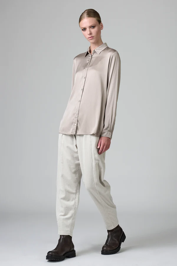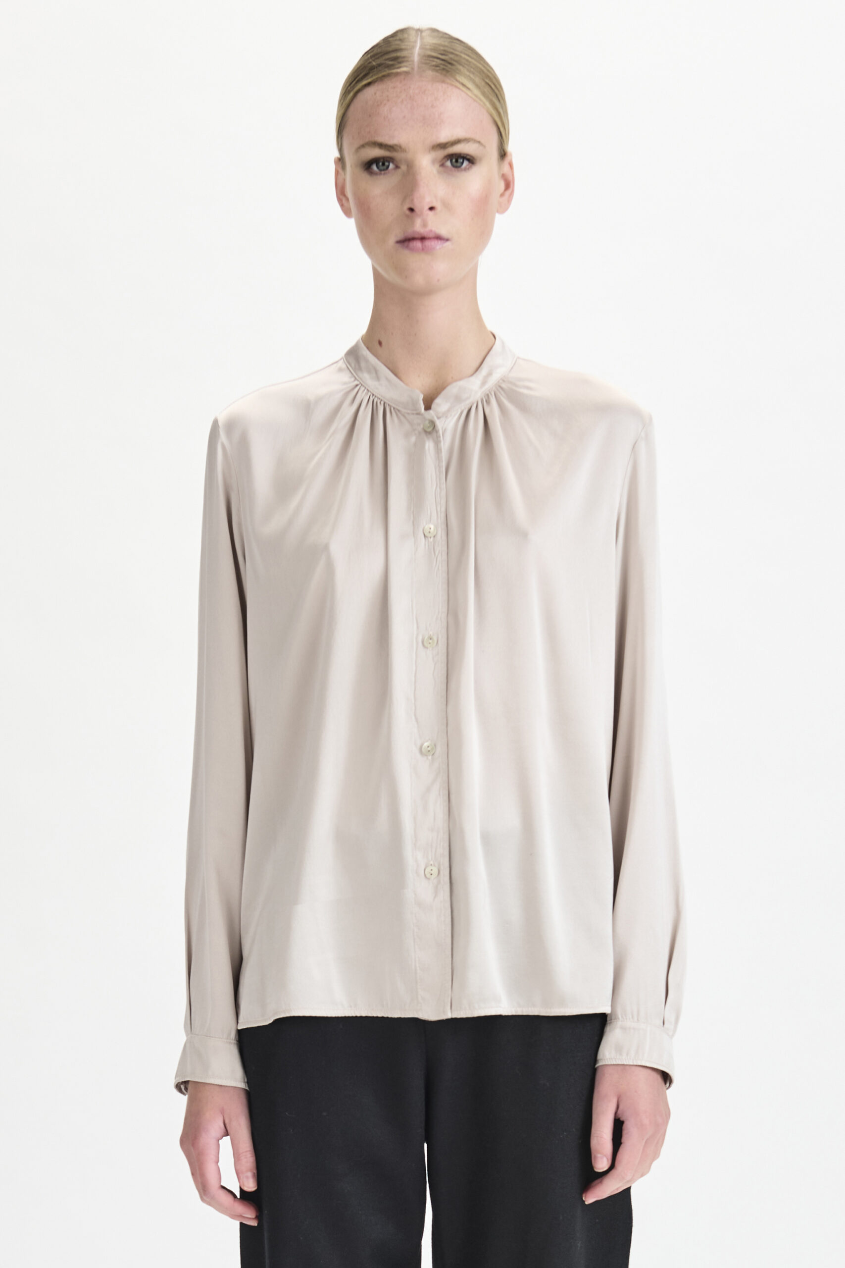 Regular-fit skjorte, fremstillet i strækbar silkessatin. Italiensk krave, manchetter med knapper og bærestykke bagpå. Garment-dyed.