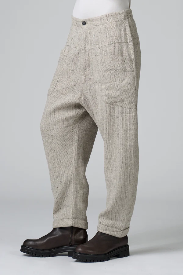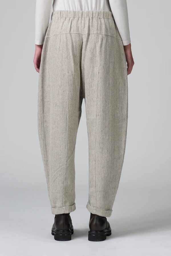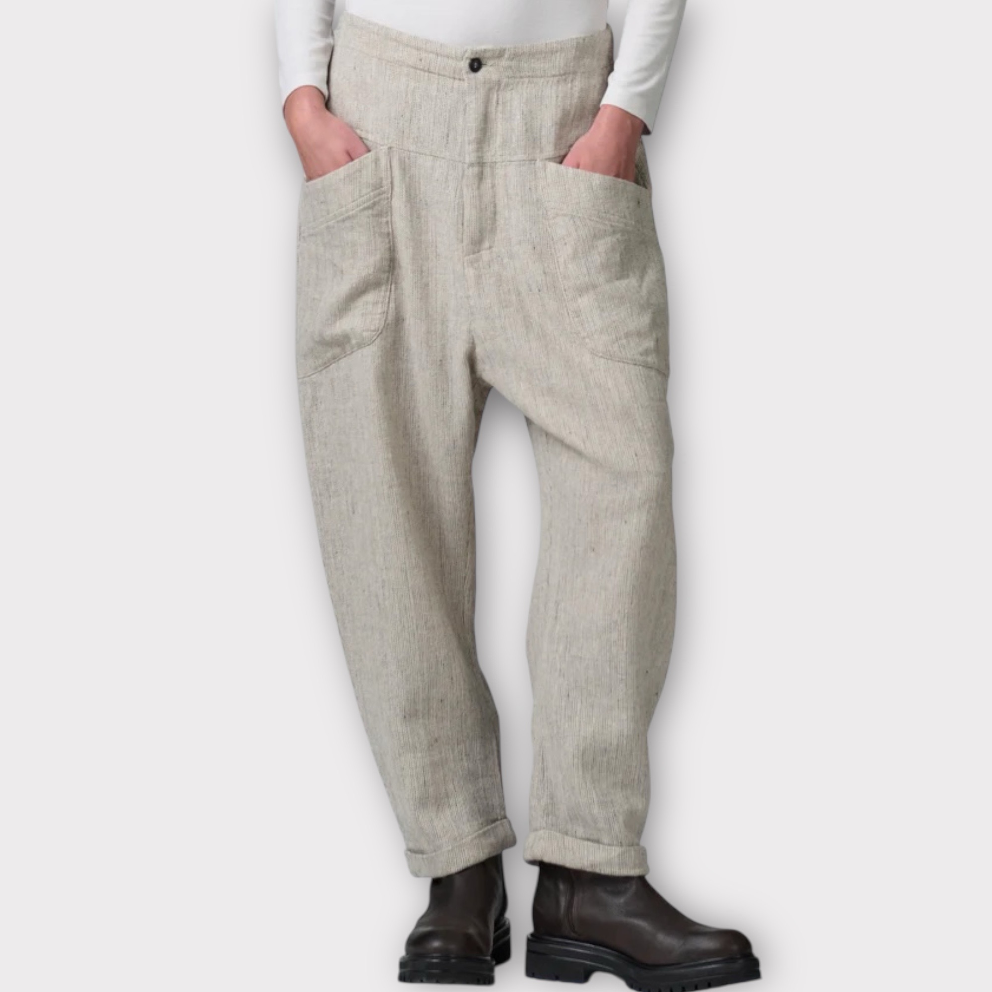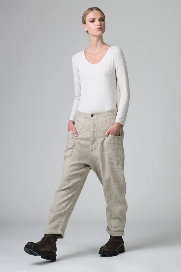 Bukser med komfortabel pasform og let sænket skridt samt knappet søm. Linningen har elastik bagpå. Bukserne er lavet af en blød, strækbar uld-hørblanding med sildebensmønster og har to påsyede lommer under bærestykket. Lukningen foran er med lynlås og knap.