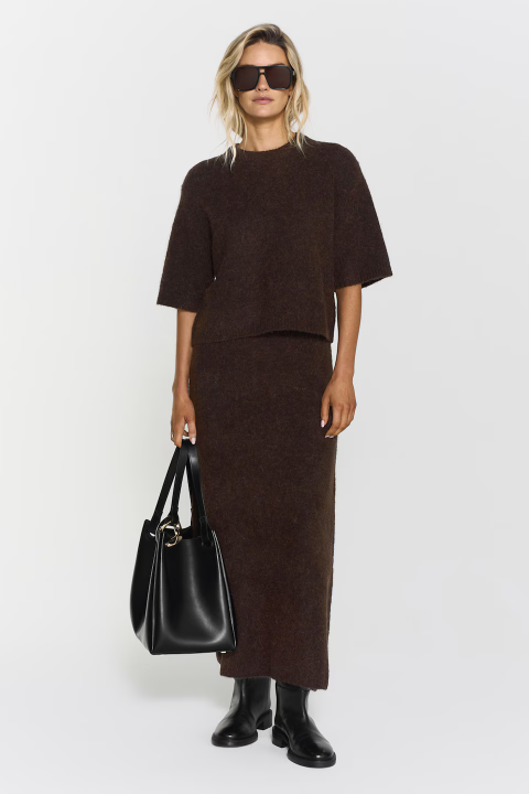 Den kortærmede Madina-strik er fremstillet af en blanding af alpaka- og merinould. Den har et stilrent design med ribkanter ved ærmer og søm, som sikrer en elegant pasform. Er du til et sæt har vi en matchende nederdel – Israa Knitted Skirt.